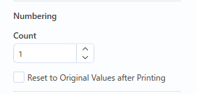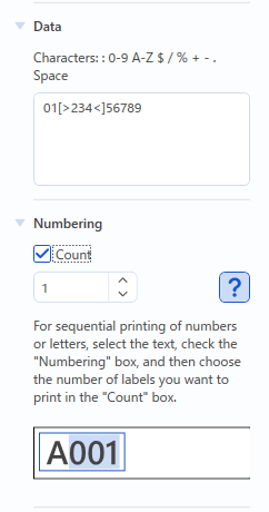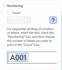 - In the “Count” box of the “Numbering” group, specify the quantity of the sequentially printed labels.